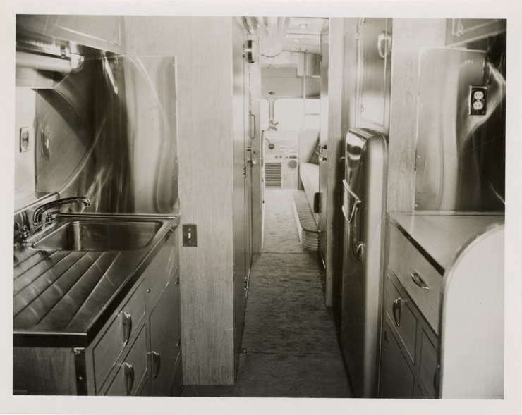 View of the interior of Flxible Land Cruiser bus, showing kitchen and hallway. Handwritten on back: "Flxible Land Cruiser."