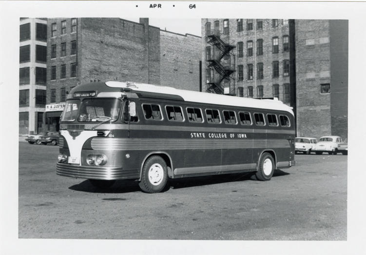 View of a Flxible bus for the State College of Iowa. Printed on front: "Apr 64." Handwritten on back: "Flxible. Iowa State Teachers College (Cedar Falls). Minneapolis, Minn."