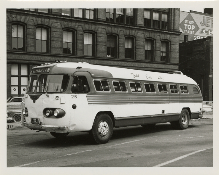 View of a Flxible bus for the Todd Bus Line. Handwritten on back: "Flxible."