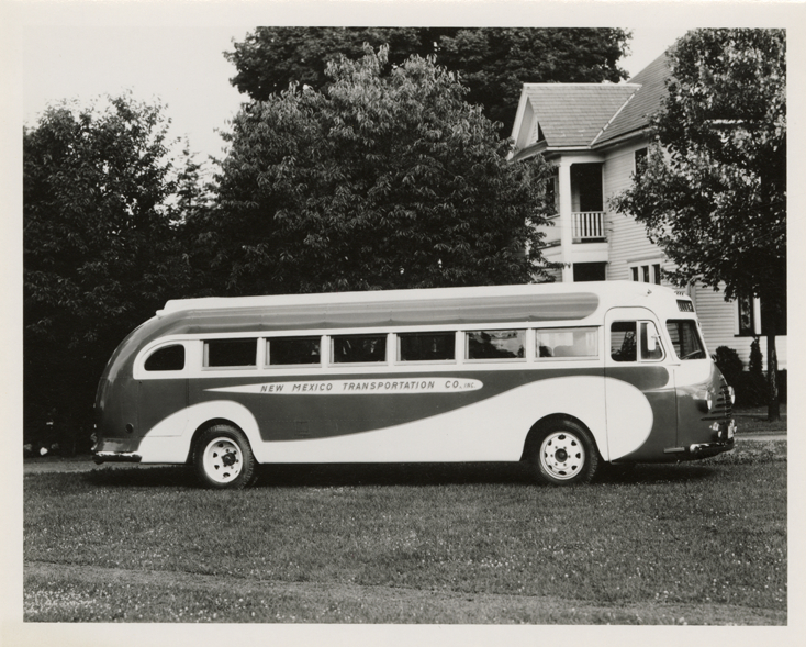 View of a Flxible bus for the New Mexico Transportation Company. Handwritten on back: "Flxible."