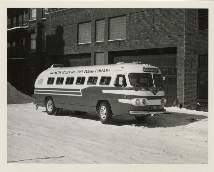 View of a Flxible bus for Rochester Yellow Cab Sight Seeing Company. Stamped on back: "W.A. Luke." Handwritten on back: "Flxible. Minneapolis. 1953."