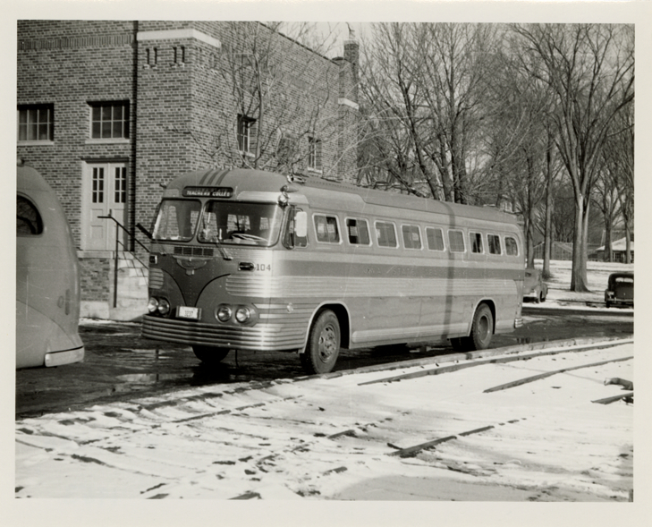 View of a Flxible bus for the State College of Iowa. Stamped on back: "W.A. Luke." Handwritten on back: "Flxible. Iowa State Teachers College (Cedar Falls). 1953."