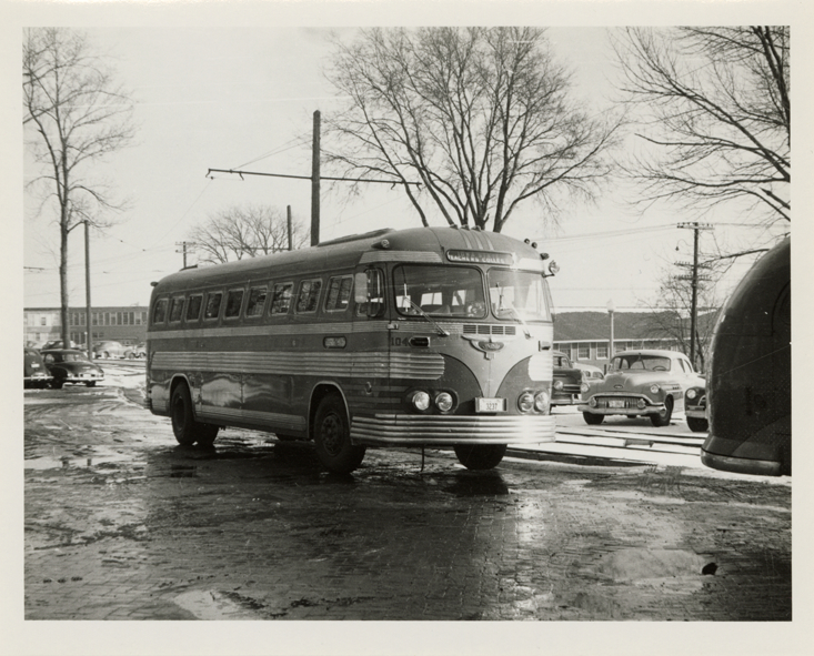 View of a Flxible bus. Stamped on back: "W.A. Luke." Handwritten on back: "Flxible."