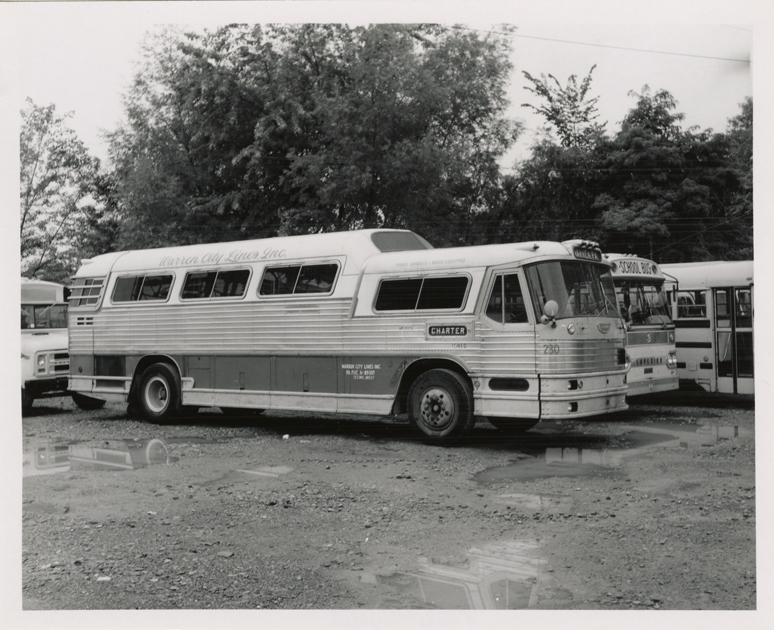 View of a Flxible bus for the Warren City Lines. Handwritten on back: "Flxible. 230. Warren City Lines, Warren, Pa., 8-16-69."