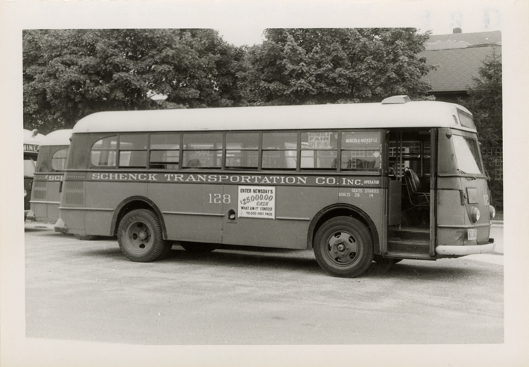 View of a Ford bus for the Schenck Transportation Co. at Long Island, New York. Typed on back: "128 Schenk Transp. Co. Floral Park LI NY, Ford."