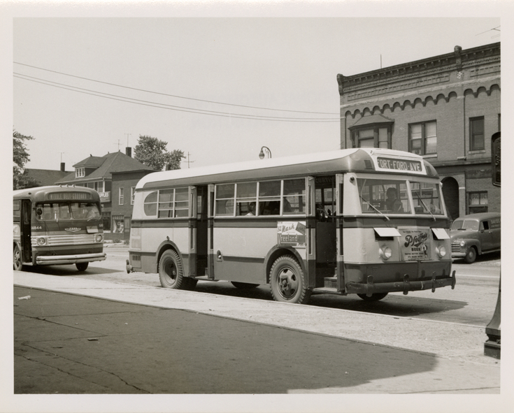 View of a Ford bus in Wyandotte, Michigan. Typed on back: "27 psgr Ford." Stamped on back: "Jul 52." Handwritten on back: "Ford."