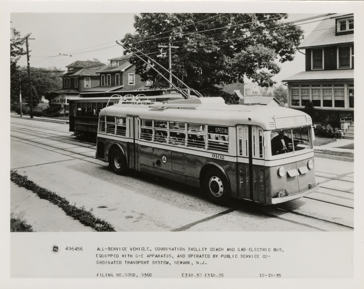 View of a General Electric trolley bus for the Public Service Coordinated Transport System, Newark, New Jersey. Printed on front: "All-service vehicle, combination trolley coach and gas-electric bus. Equipped with G-E apparatus, and operated by Public Service Coordinated Transport System, Newark, N.J. Filing no. 9280, 9360. E318.32 E318.35. 10-15-35."