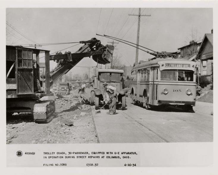 View of a General Electric trolley bus passing road construction in Columbus, Ohio. Power shovel on left. Printed on front: "Trolley coach, 30-passenger, equipped with G-E apparatus, in operation during street repairs at Columbus, Ohio. Filing no. 9280. E318.32. 4-16-34." Handwritten on back: "General Electric."