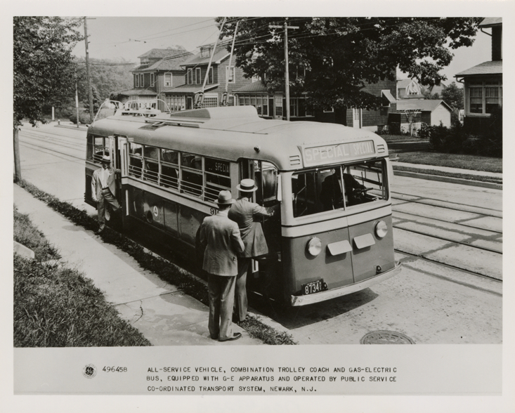 View of passengers boarding a General Electric trolley bus for the Public Service Coordinated Transport System, Newark, New Jersey. Printed on front: "All-service vehicle, combination trolley coach and gas-electric bus, equipped with G-E apparatus and operated by Public Service Co-ordinated Transport System, Newark, N.J." Handwritten on back: "General Electric trolley coach."