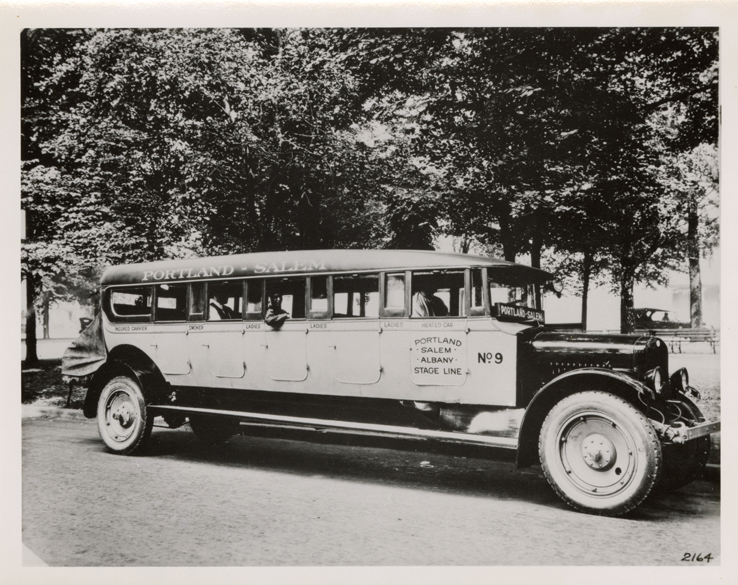 View of a GMC bus for the Portland Salem Albany Stage Line. Handwritten on back: "GMC."
