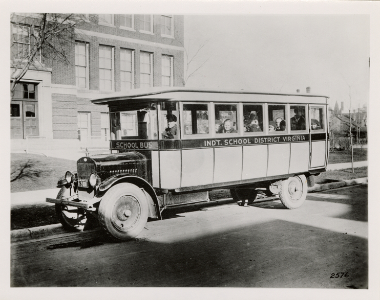 View of passengers in a GMC school bus in Virginia. Handwritten on back: "GMC."