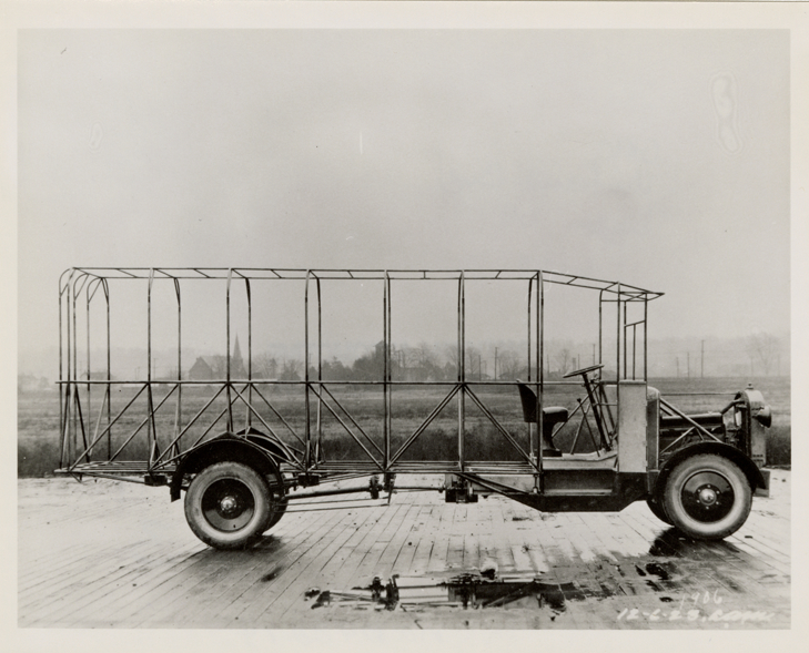View of a GMC Uniframe bus. Printed on front: "12-6-23." Handwritten on back: "GMC. Uniframe bus. Dayton, OH. 12-6-23."