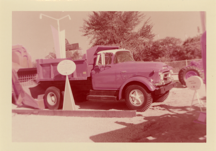 View of a GMC truck on display at the 1955 General Motors Powerama. Handwritten on back: "GMC, Powerama, Chgo., Ill., 1955."