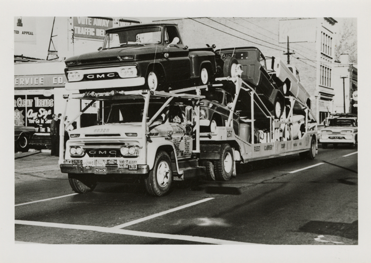 View of a GMC car hauler, carrying GMC trucks. Handwritten on back: "GMC."