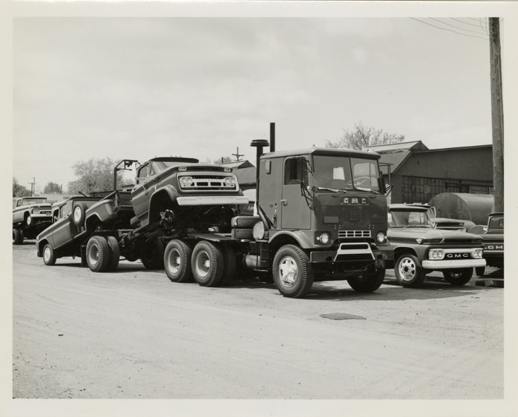 View of a GMC car hauler, carrying Chevrolet trucks. Stamped on back: "May 11 1963." Handwritten on back: "GMC."