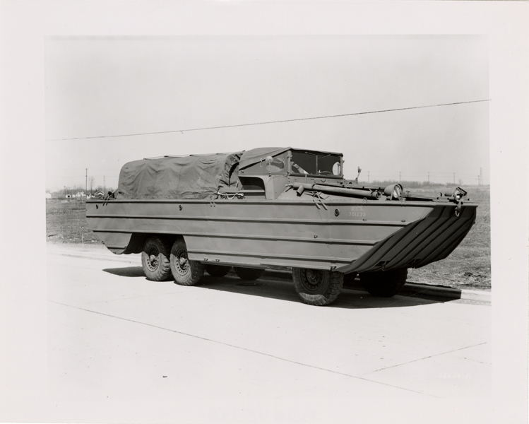 View of a GMC amphibious truck (DUKW). Handwritten on back: "GMC World War II, 'Duck', 6 x 6."