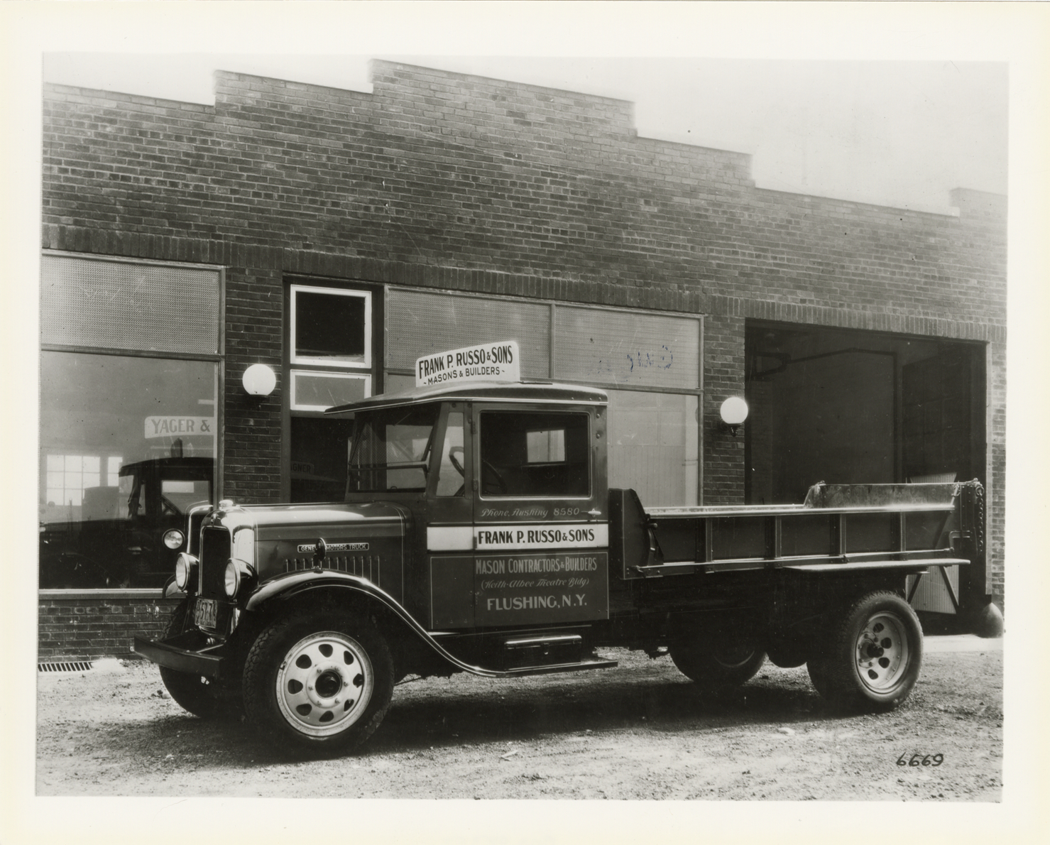 View of a GMC truck for Frank P. Russo & Sons. Painted on side of truck: "Frank P. Russo & Sons. Mason contractors & builders, Flushing, N.Y." Handwritten on back: "GMC."