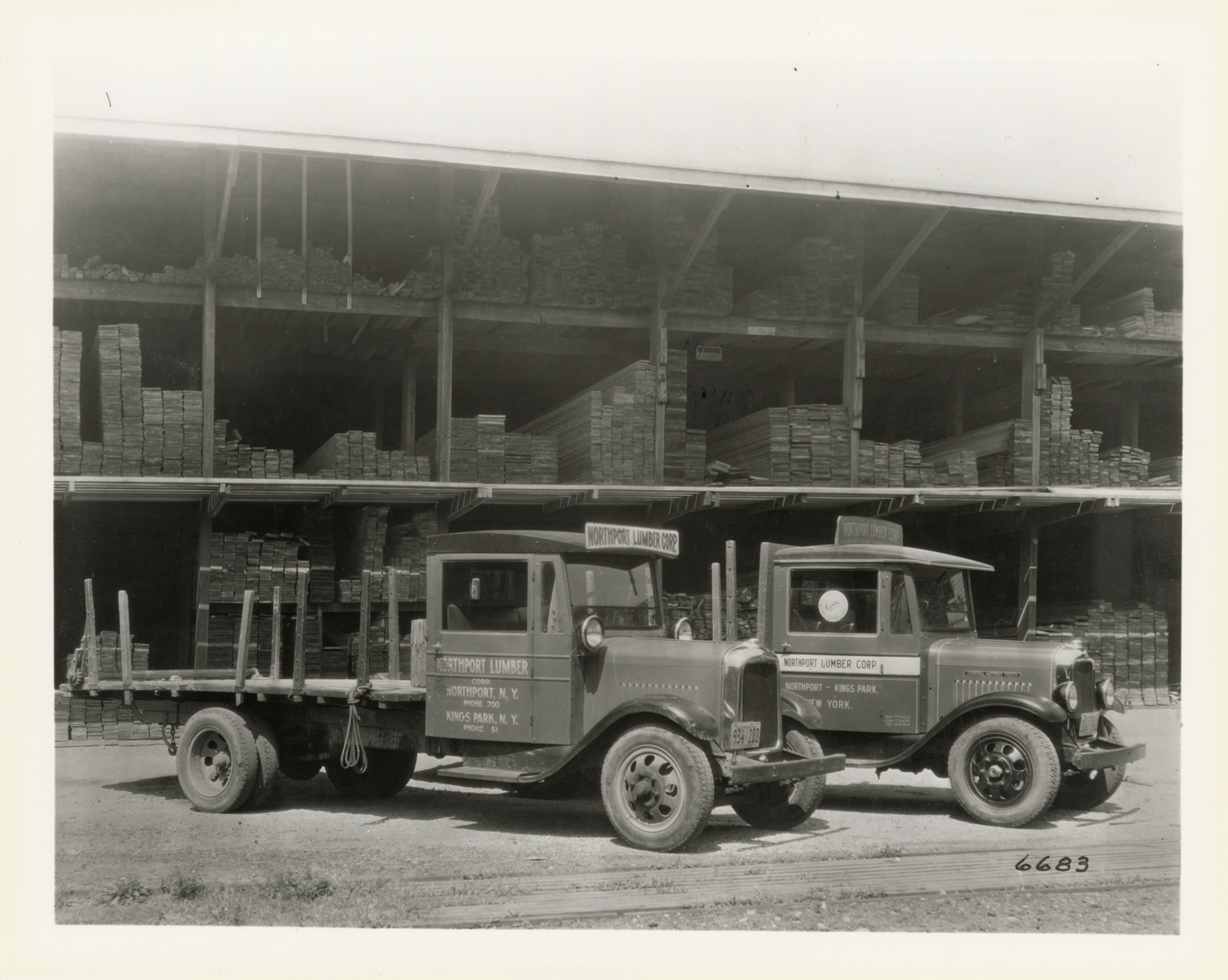 View of two GMC trucks for the Northport Lumber Corp. Stacks of lumber in background. Painted on side of truck: "Northport Lumber Corp. Northport, N.Y., phone 700. Kings Park, N.Y., phone 51." Handwritten on back: "GMC."