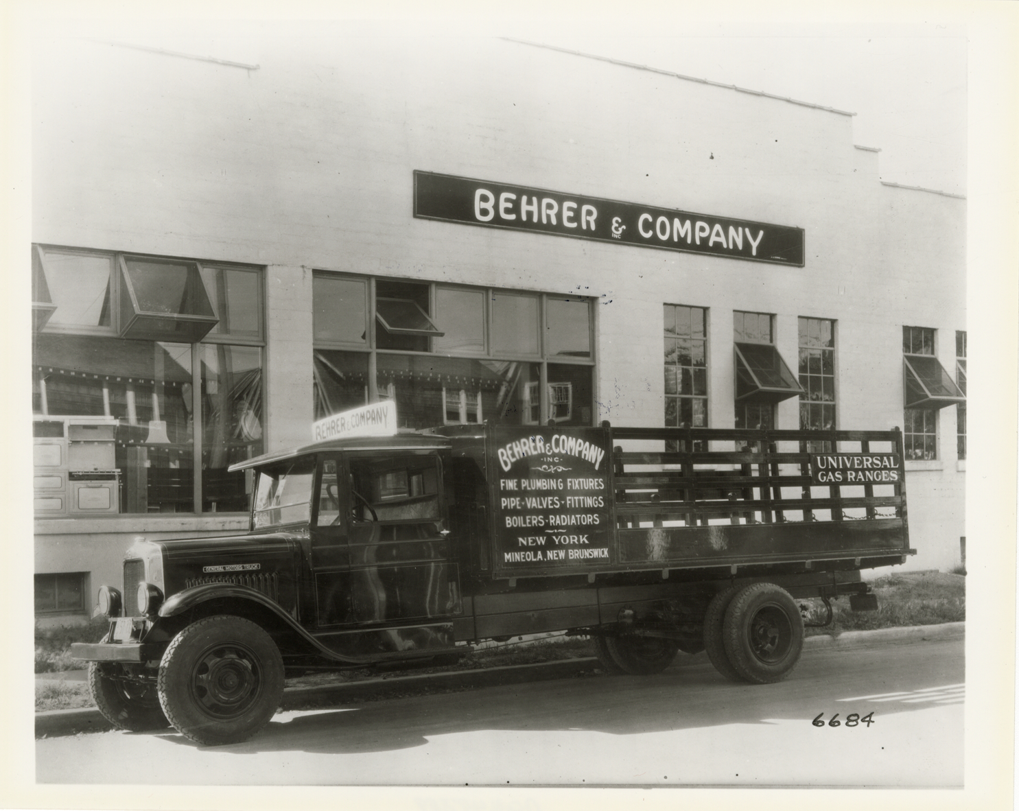 View of a GMC truck for Behrer & Company. Painted on side of truck: "Behrer & Company, Inc. Fine plumbing fixtures, pipes, valves, fittings, boilers, radiators. New York, Mineola, New Brunswick. Gas ranges." Behrer & Company building in background. Handwritten on back: "GMC."