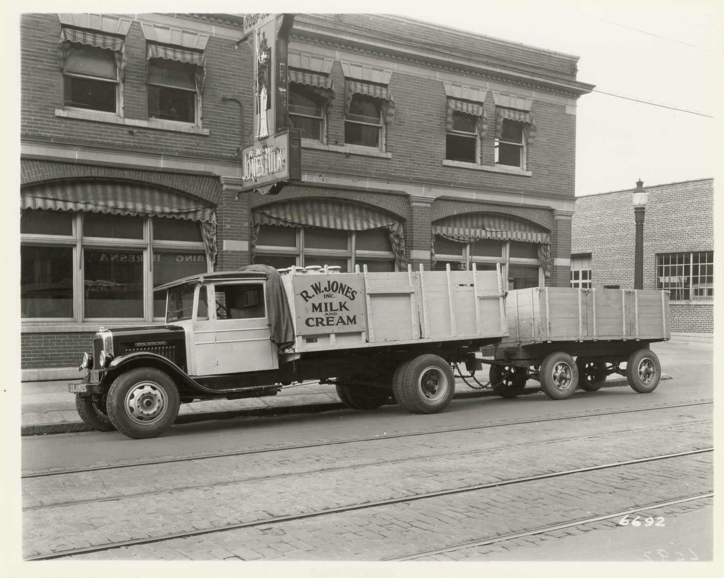 View of a GMC truck for R.W. Jones, Inc. Painted on side of truck: "R.W. Jones, Inc. Milk and cream." Truck hauls trailer; R.W. Jones, Inc. building in background. Handwritten on back: "GMC."