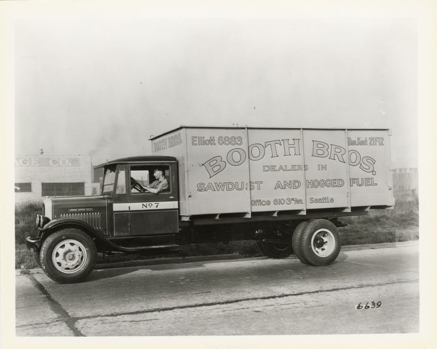 View of a driver posing in a GMC truck for Booth Bros. Painted on side of truck: "Booth Bros. Dealers in sawdust and hogged fuel. Office 610 3rd Ave., Seattle. Elliott 6883; res. Kent 21F12." Handwritten on back: "GMC."