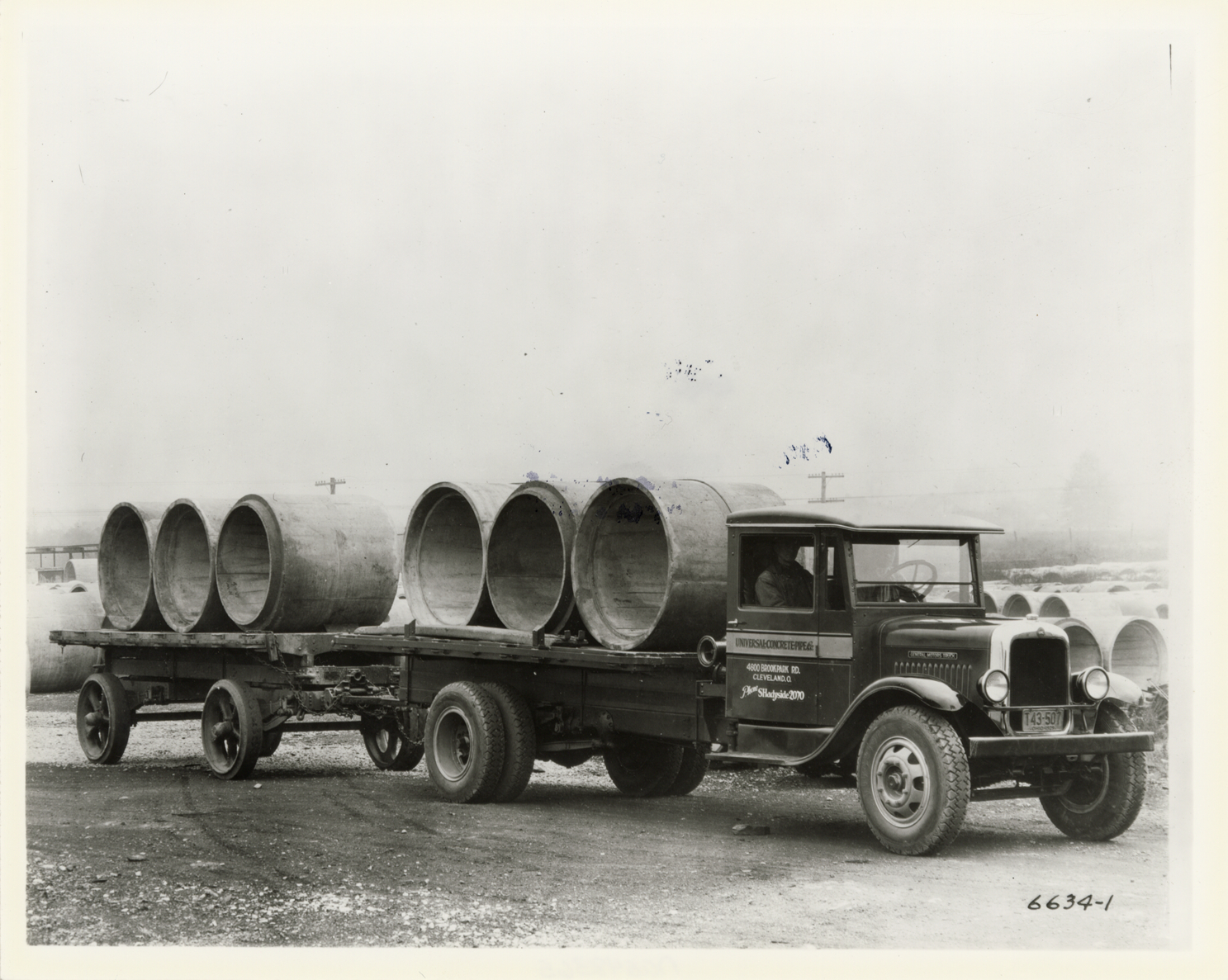 View of a driver and passenger posing in a GMC truck for Universal Concrete Pipe Co. Painted on side of truck: "Universal Concrete Pipe Co. 4800 Brookpark Rd., Cleveland, O. Phone Shadyside 2070." Handwritten on back: "GMC."