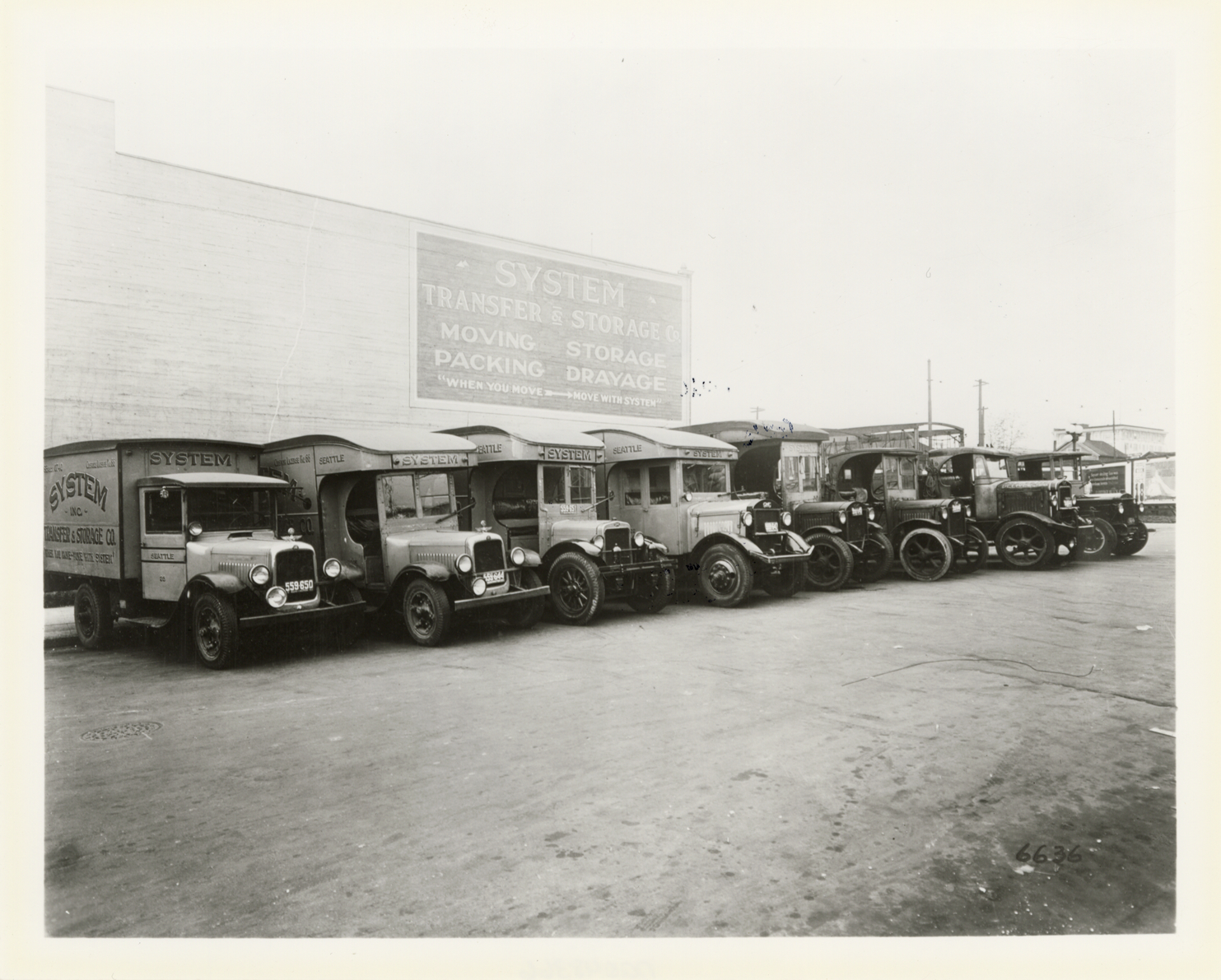 View of a row of GMC trucks for System Transfer & Storage Co. Brick wall sign reads: "System Transfer & Storage Co., moving, storage, package, drayage. When you move, move with System." Handwritten on back: "GMC."