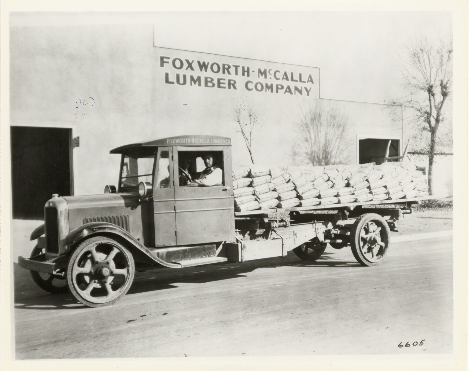 View of a driver posing in a GMC truck for the Foxworth-McCalla Lumber Company. Painted on side of truck: "Foxworth-McCalla Lumber Co." Handwritten on back: "GMC."