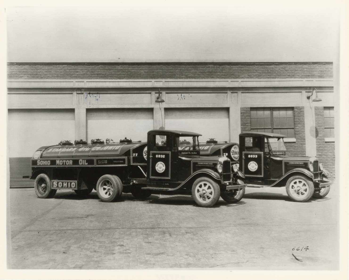 View of two GMC trucks for the Standard Oil Co., Ohio. Painted on truck in foreground: "Standard Oil Co., Ohio. Sohio motor oil." Handwritten on back: "GMC."