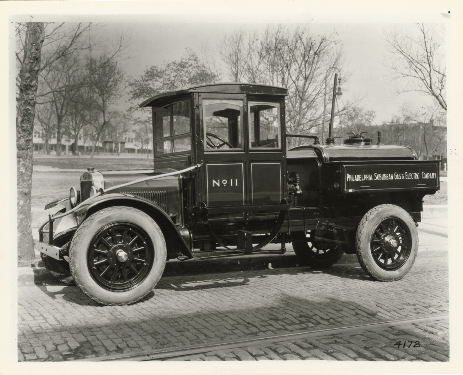 View of a GMC truck for the Philadelphia Suburban Gas & Electric Company. Painted on side of truck: "No. 11." Handwritten on back: "GMC."