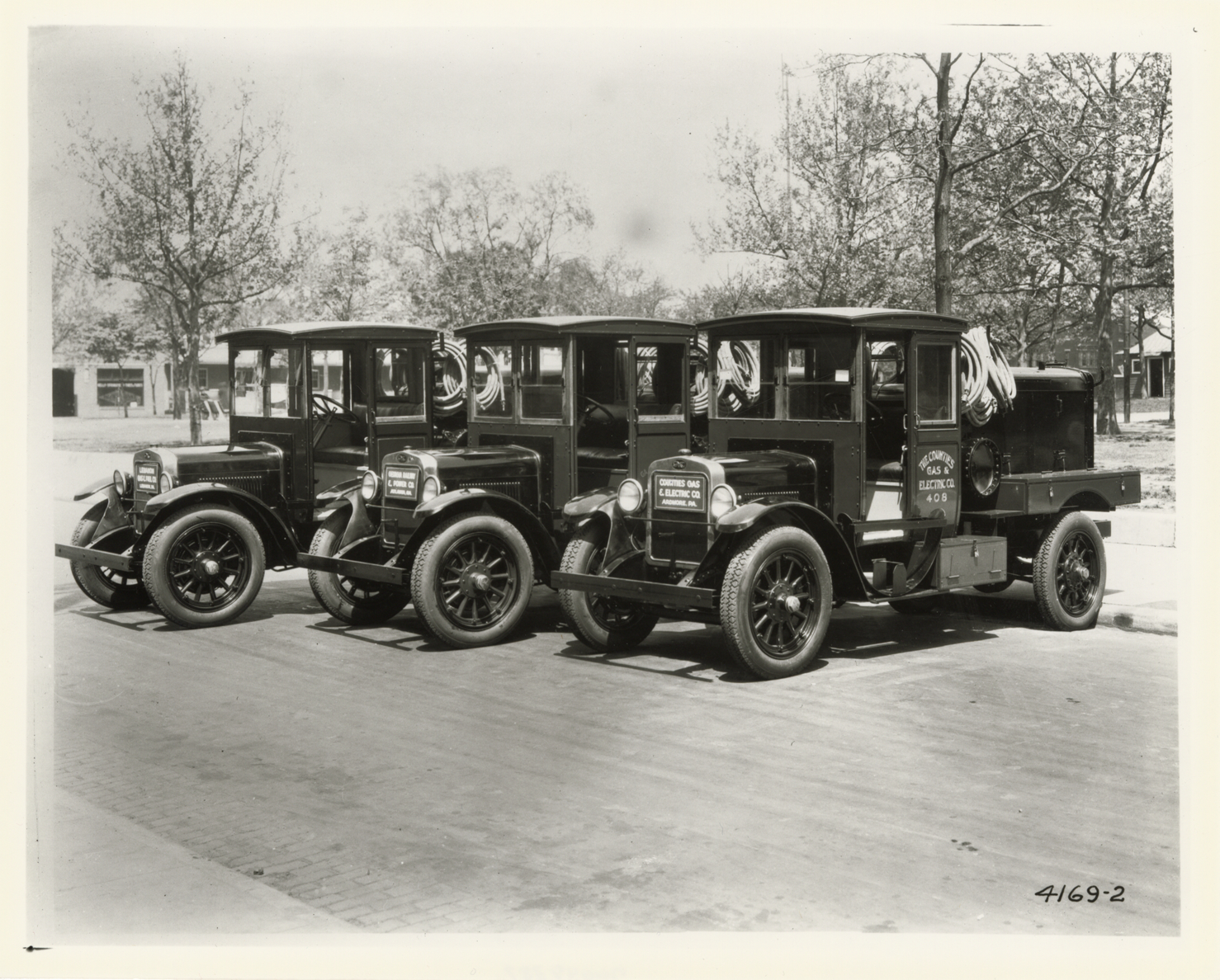 View of three GMC trucks for the Counties Gas & Electric Co. Painted on side of truck: "Counties Gas & Electric Co. Ardmore, Pa." Handwritten on back: "GMC."