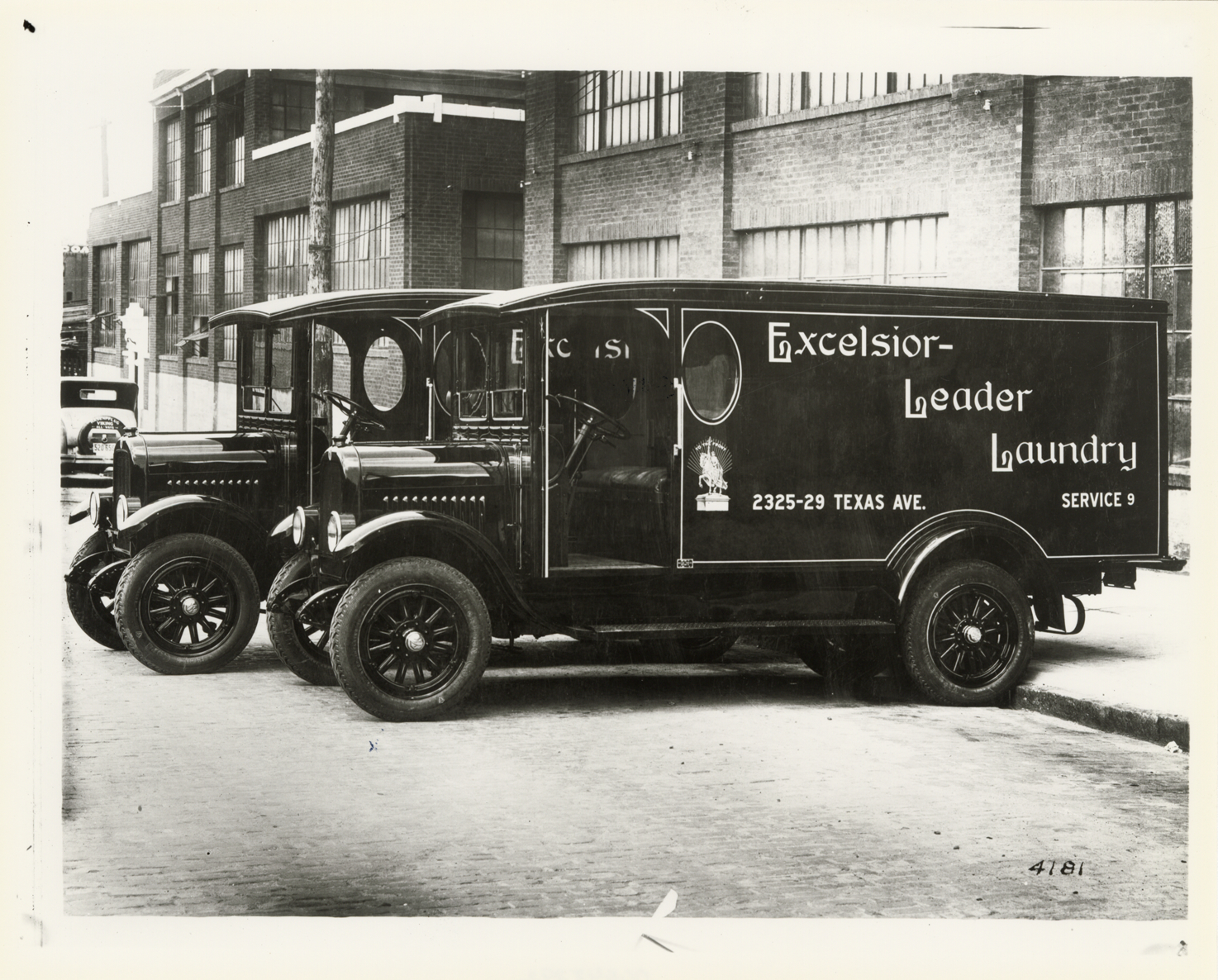 View of two GMC trucks for Excelsior-Leader Laundry. Painted on side of truck: "Excelsior-Leader Laundry. 2325 Texas Ave., Service 9." Handwritten on back: "GMC."
