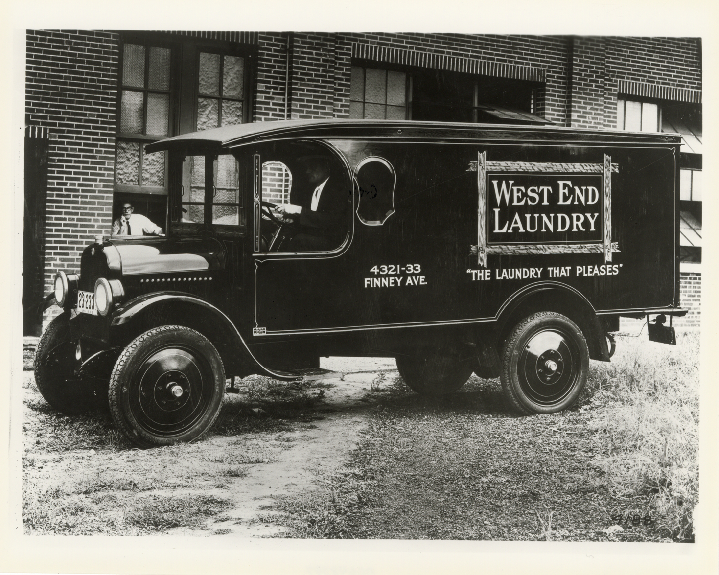 View of a driver posing in a GMC truck for the West End Laundry. Painted on side of truck: "West End Laundry. The laundry that pleases. 4321-33 Finney Ave." Handwritten on back: "GMC."