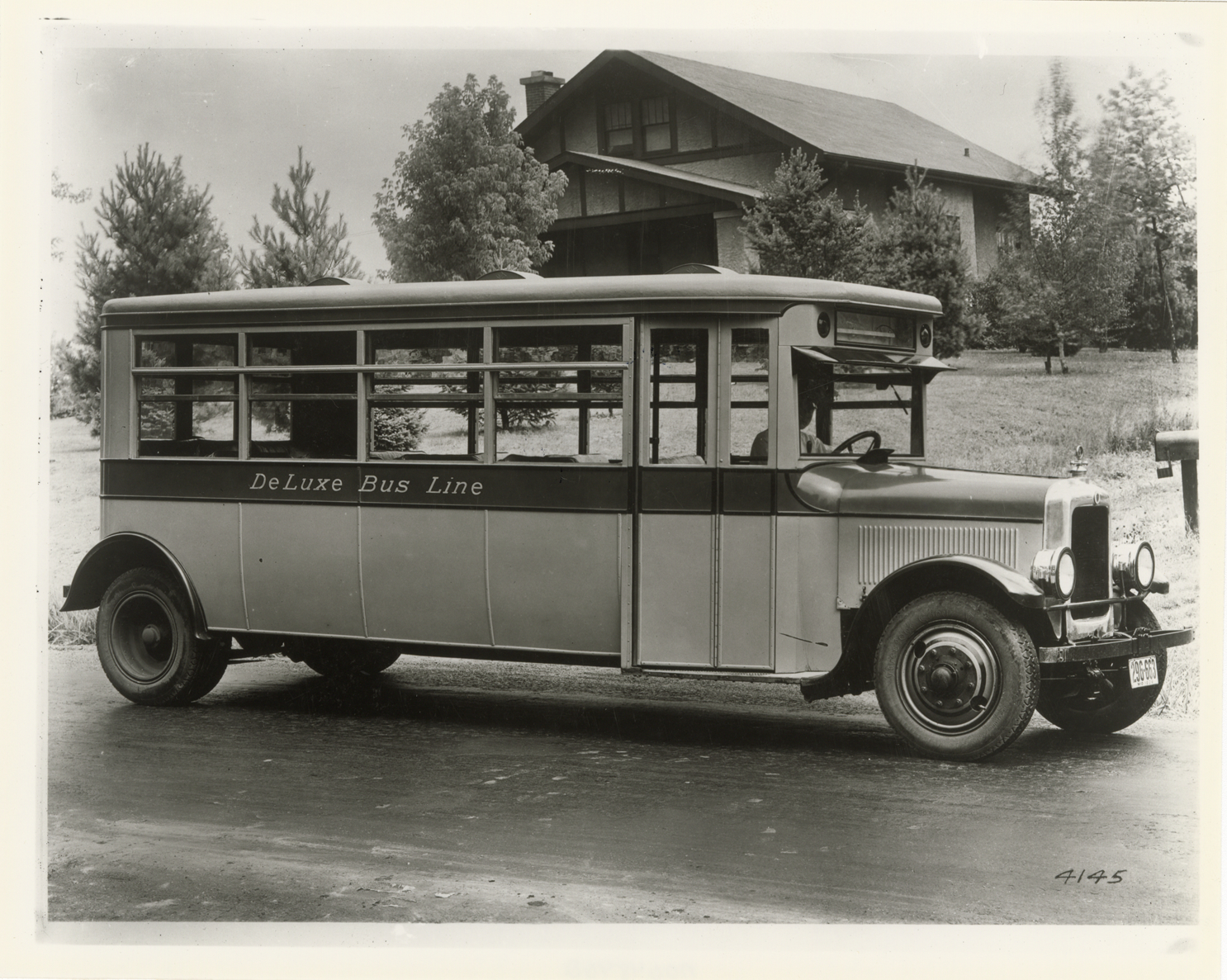 View of a GMC bus for the DeLuxe Bus Line. Handwritten on back: "GMC."