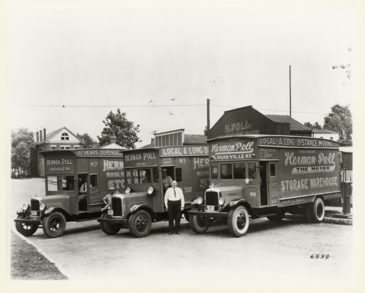 View of men posing with three GMC trucks for Herman Poll. Painted on side of truck on right: "Herman Poll, the mover. Storage warehouse. Local & long distance moving. Cargo insured. Magnolia 3587. Mary & Swan Sts. Louisville, KY." Handwritten on back: "GMC."