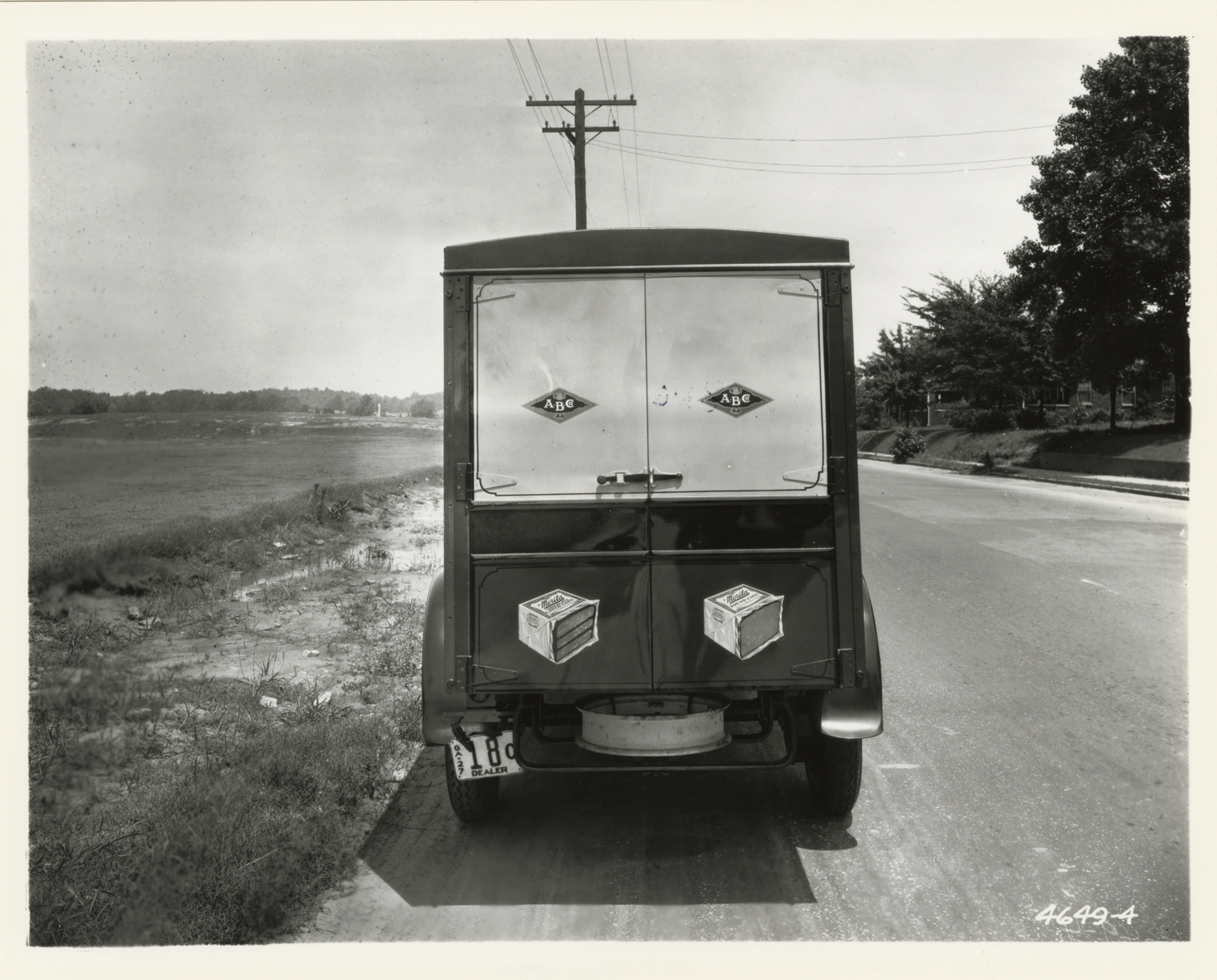 Rear view of a GMC truck for Merita bread, American Bakeries Company. Images of Merita layer and pound cakes on rear doors. Handwritten on back: "GMC."