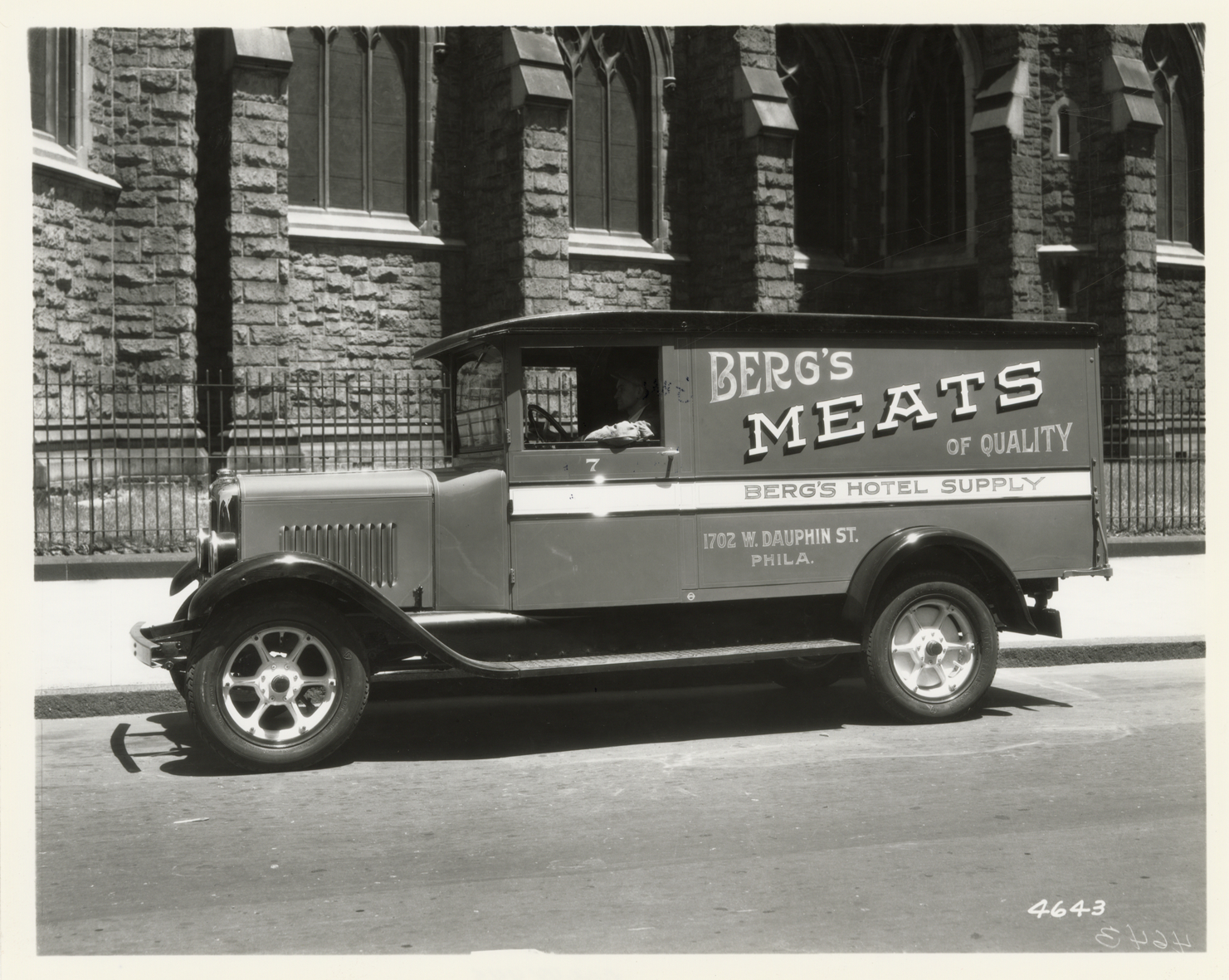 View of a GMC truck for Berg's meats. Painted on side of truck: "Berg's meats of quality. Berg's Hotel Supply. 1702 W. Dauphin St., Phila." Handwritten on back: "GMC."