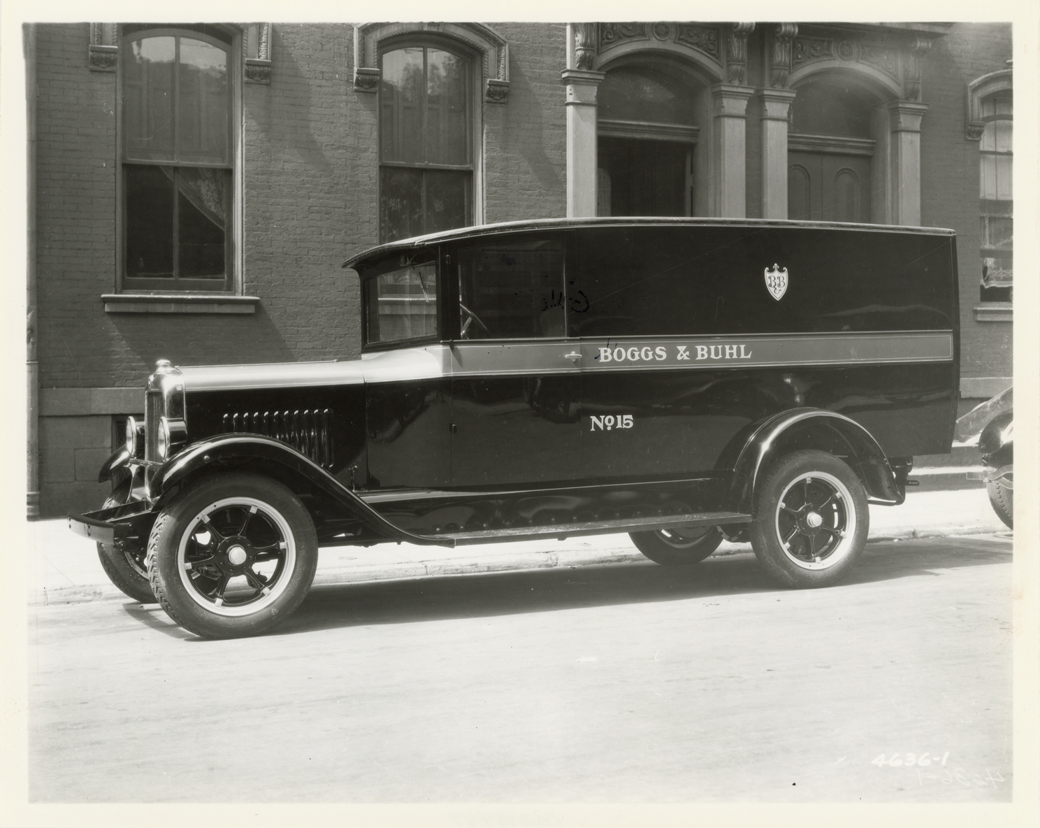 View of a GMC truck for Boggs & Buhl. Painted on side of truck: "Boggs & Buhl. No. 15." Handwritten on back: "GMC."