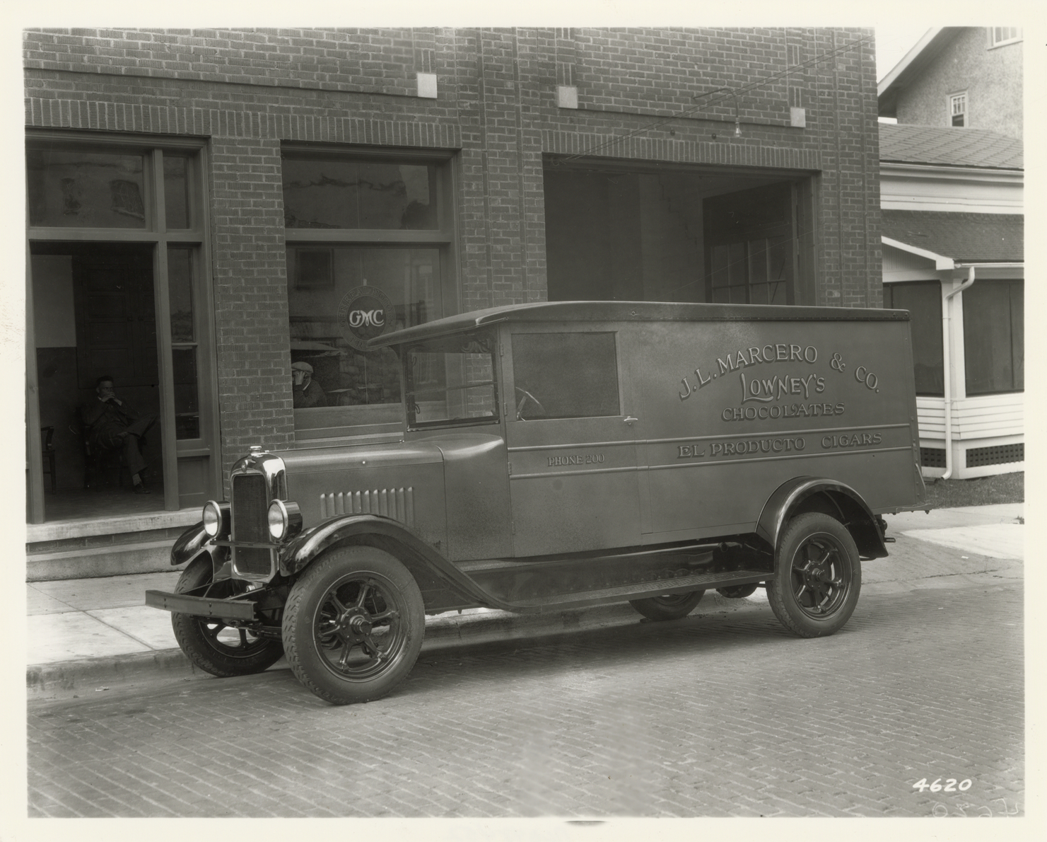 View of a GMC truck for J.L. Marcero & Co. Painted on side of truck: "J.L. Marcero & Co. Lowney's chocolates. El Producto cigars. Phone 200." Handwritten on back: "GMC."