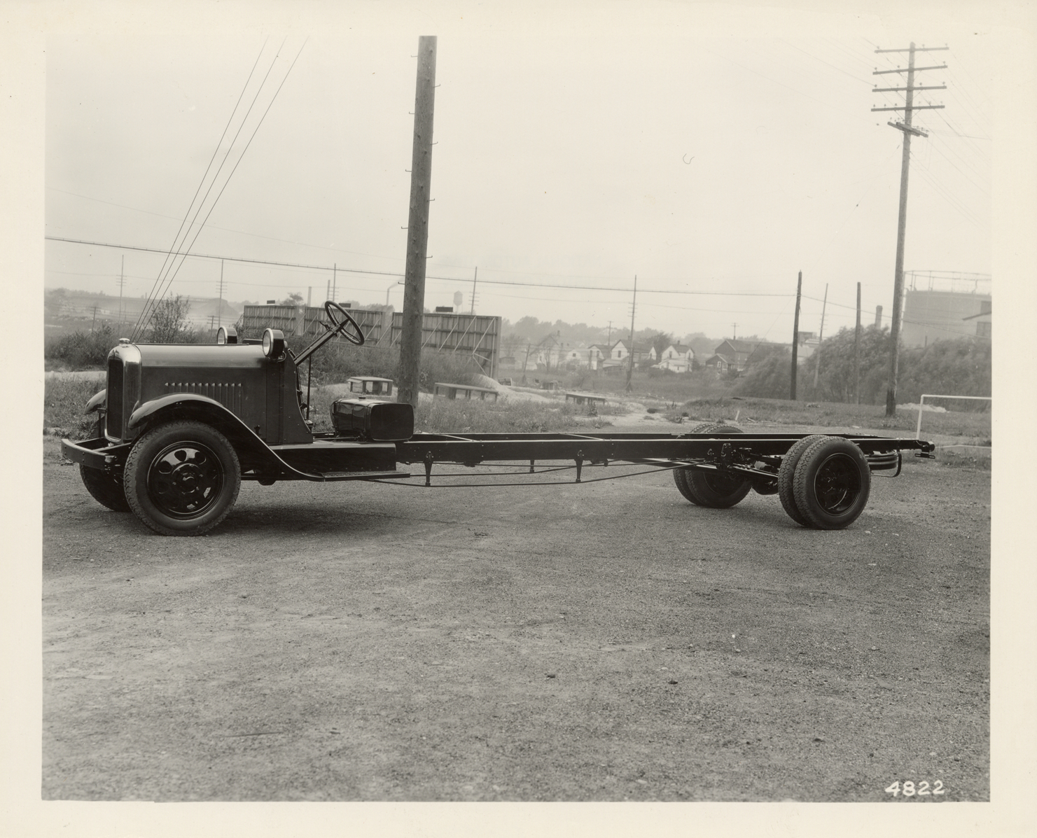 View of a GMC truck chassis. Handwritten on back: "GMC."