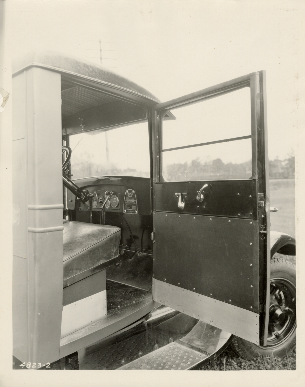 View of a the interior of a GMC truck. Open passenger door shows steering wheel, seats and instrument panel. Handwritten on back: "GMC."