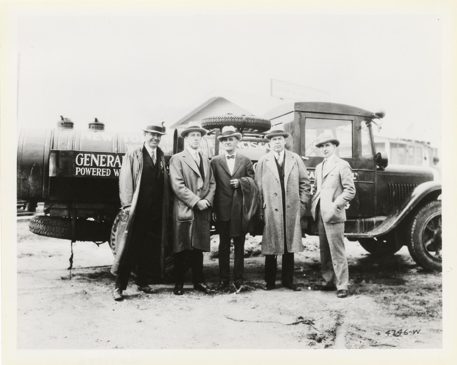 View of several unidentified men posing in GMC truck driven by "Cannon-Ball" Baker from New York to San Francisco. Handwritten on back: "GMC."