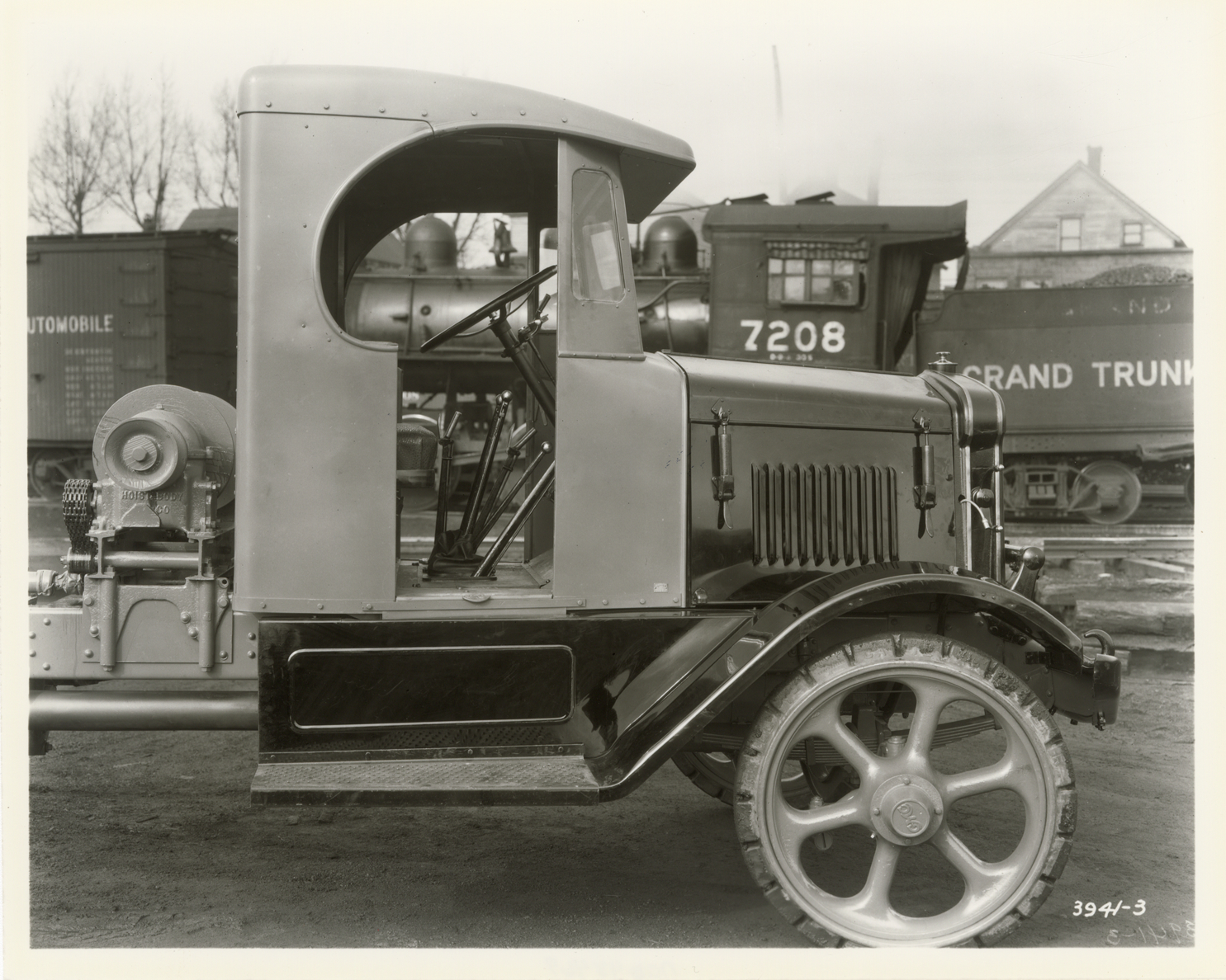 View of a GMC truck with hoist mechanism. Handwritten on back: "GMC."