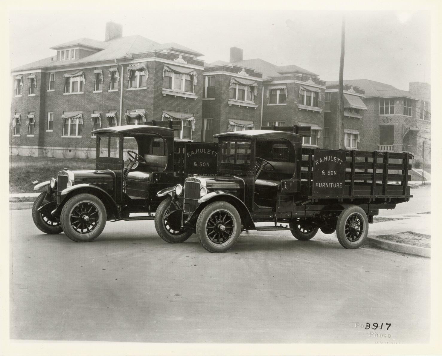 View of two GMC trucks for F.A. Hulett & Son. Painted on truck: "F.A. Hulett & Son, furniture." Handwritten on back: "GMC."
