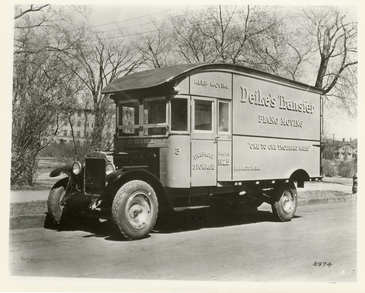 View of a GMC truck for Deike's Transfer. Painted on truck: "Deike's Transfer. Piano moving. One to one thousand miles. Keep moving. Fireproof storage. Phone 1125. Mankato, Minn." Handwritten on back: "GMC."