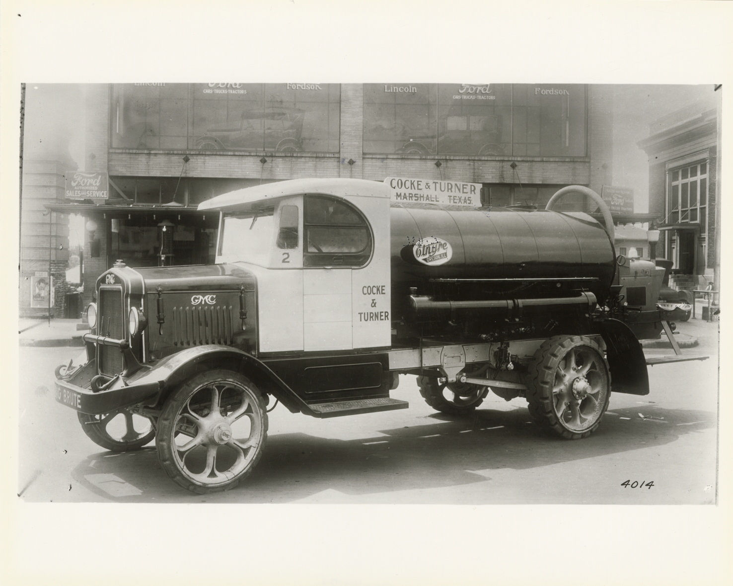 View of a GMC truck for Cocke & Turner. "Cocke & Turner, Marshall, Texas" sign in background. "Entyre, Oregon, Ill." sign on tank. Handwritten on back: "GMC."