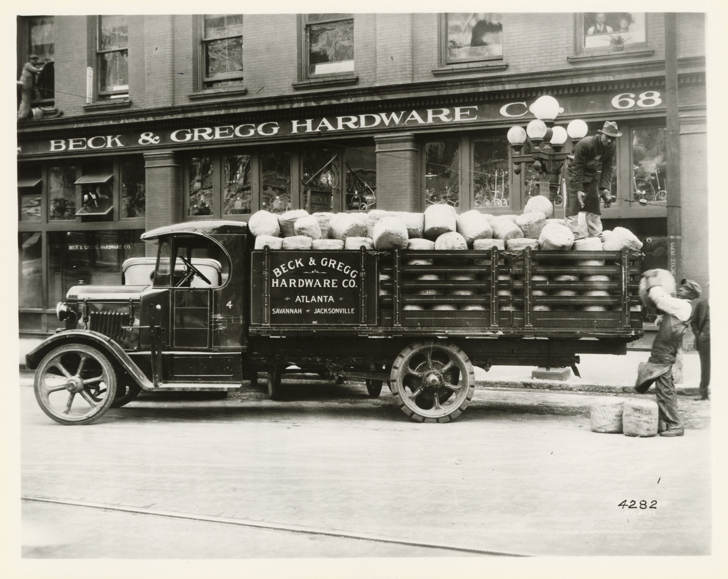 View of two men unloading a GMC truck for the Beck & Gregg Hardware Co. Painted on side of truck: "Beck & Gregg Hardware Co. Atlanta, Savannah, Jacksonville." Handwritten on back: "GMC."