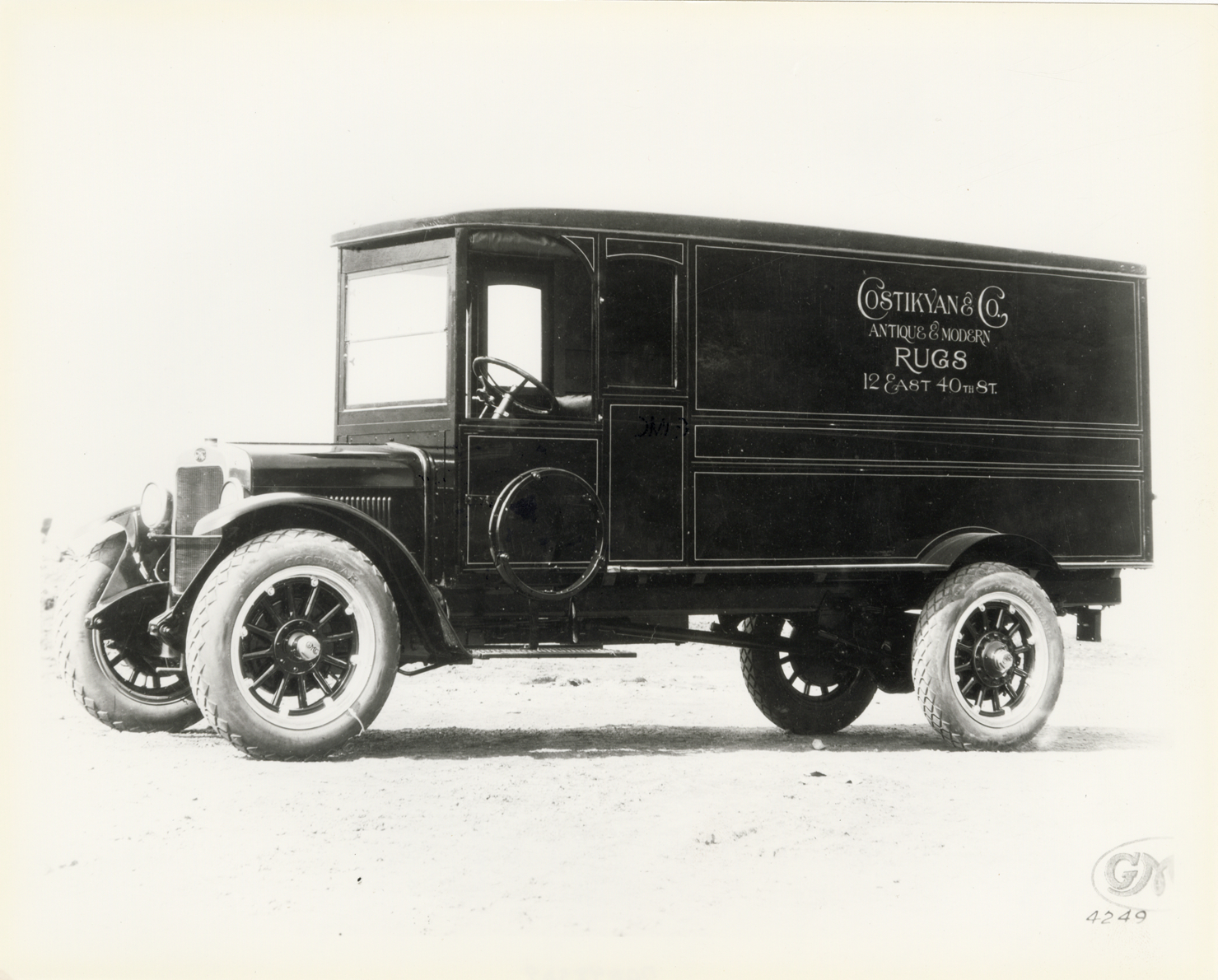 View of a GMC truck for Costikyan & Co. Painted on side of truck: "Costikyan & Co. Antique & modern rugs. 12 East 40th St." Handwritten on back: "GMC."