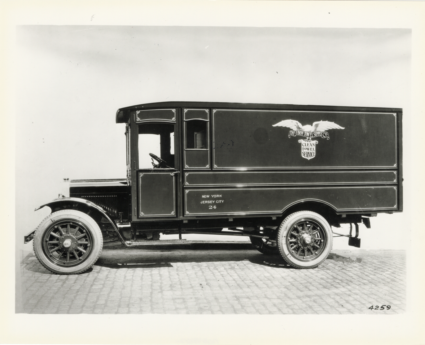 View of a GMC truck for the Union Towel Supply Co. Painted on side of truck: "The Union Towel Supply Co., clean towel service. New York, New Jersey 24." Handwritten on back: "GMC."