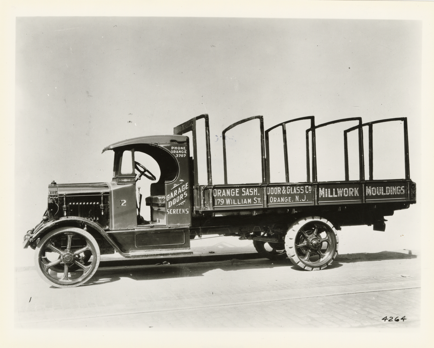 View of a GMC truck for the Orange Sash Door & Glass Co. Painted on side of truck: "Orange Sash Door & Glass Co. 179 William St., Orange, N.J. Millwork, mouldings, garage doors, screens. Phone Orange 3767." Handwritten on back: "GMC."